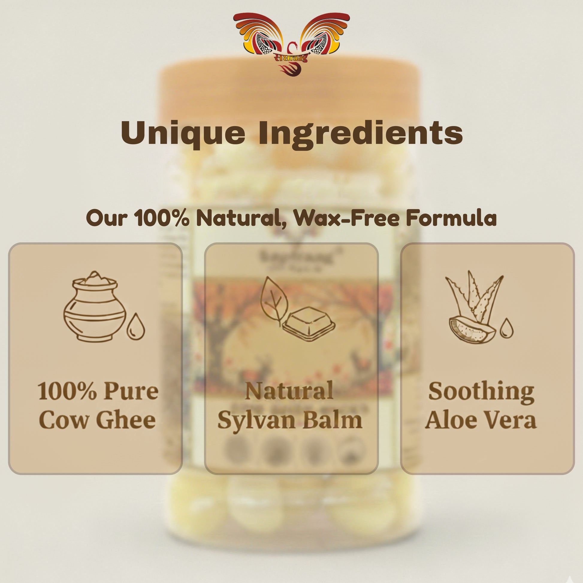We use only Pure Cow Ghee, uniquely hardened with a 100% natural "Sylvan Balm" (a sacred forest-based butter) and enriched with soothing Aloe Vera.