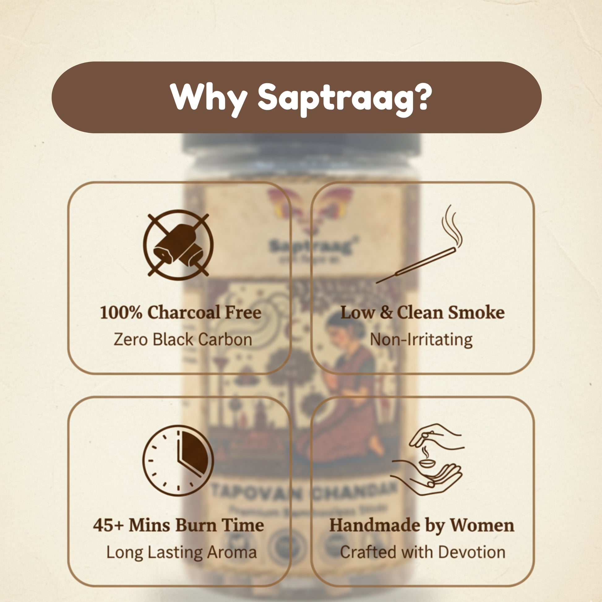You choose Saptraag for our Three Pillars of Purity: 100% Bambooless, 100% Charcoal-Free, and 100% Real Sandalwood.